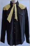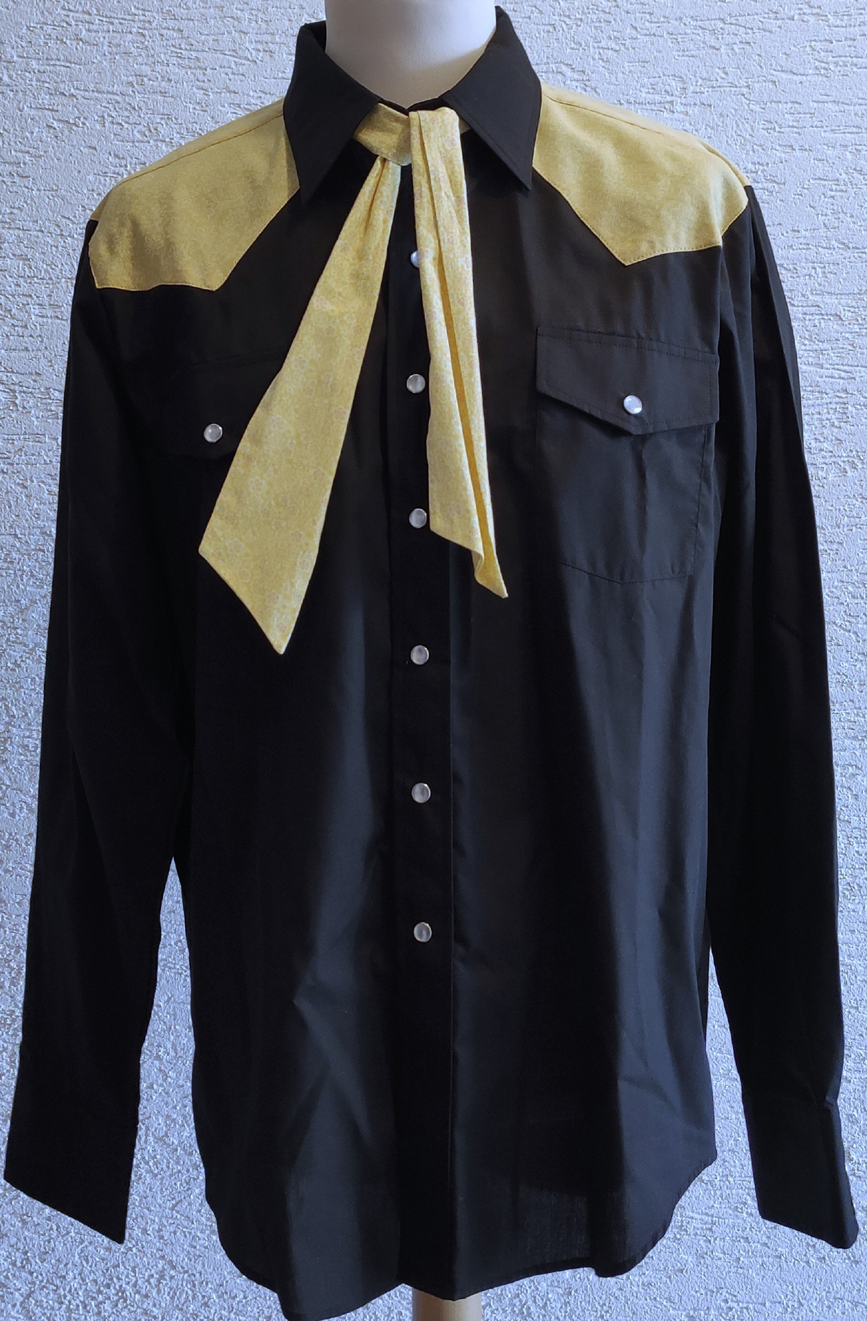 schwarzes Herrrenhemd der Marke Malco Modes 2 aufgesetzte Brusttasche weisse Perlmutdruckknöpfeauf dem Hemd wurde ein ockerfarbener Sattel professionell aufgenähtockerfarbene Herrenkrawatte kann für 7€ mitbestellt werden gerade geschnittenMaterial:65% Polyester35% CottonNeuwertig!