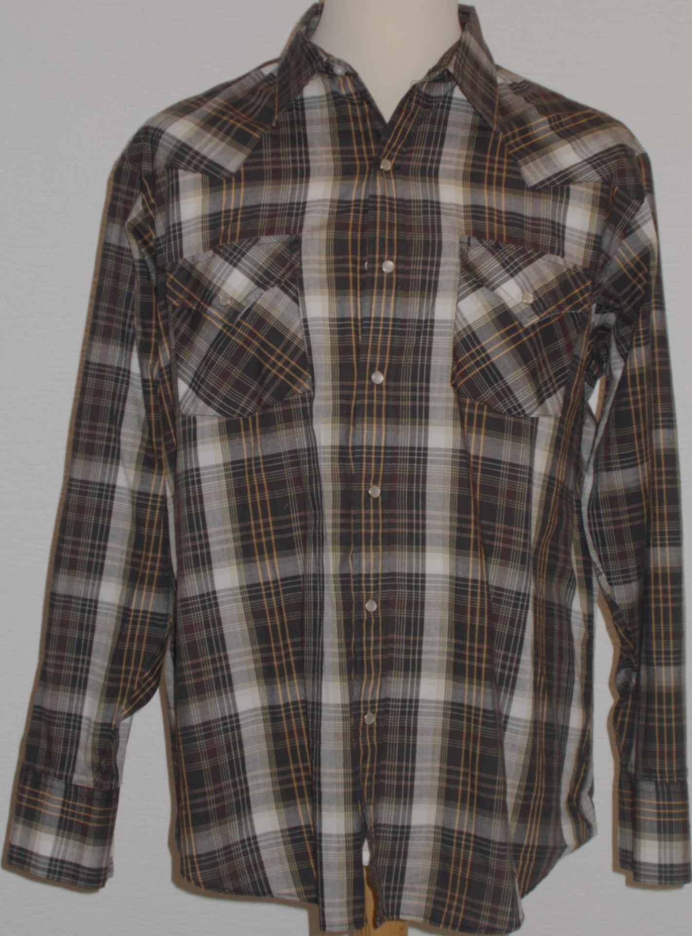 schwarz-weiss, braun karriertes Hemd der Marke Ely Cattleman Gr. L 2 aufgesetzte Brusttaschen mit weissen Perlmutdruckknöpfen gerade geschnittenMaterial:65% Polyester35% Cotton
