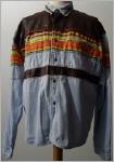 Jeanshemd in hellem jeansblauhinten und vorne mit dunkelbraunem Kunstledersatteldas Hemd ist reichlich verziert oberhalb der Brust und oberhalb der Ärmel hat das Hemd verschiedenfarbige Streifen (orange und gelb dominieren)auf der linken Brustseite befindet sich eine Eingriffstasche die mit einem Druckknopf geschlossen werden kann Material:100 % CottonKunstlederguter Zustand