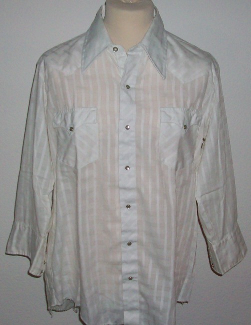 häufig benutztes weisses Hemd mit Gebrauchsspuren (deshalb ein Schnäppchen) der untere Saum ist ausgefranst (in der Hose nicht sichtbar) frisch gewaschen, keine Flecken in sich gemustert US-Grösse 17-33 extra long Tail weisse Perlmuttdruckknöpfe 2 aufgesetzte Brusttaschen