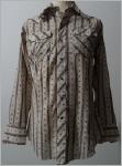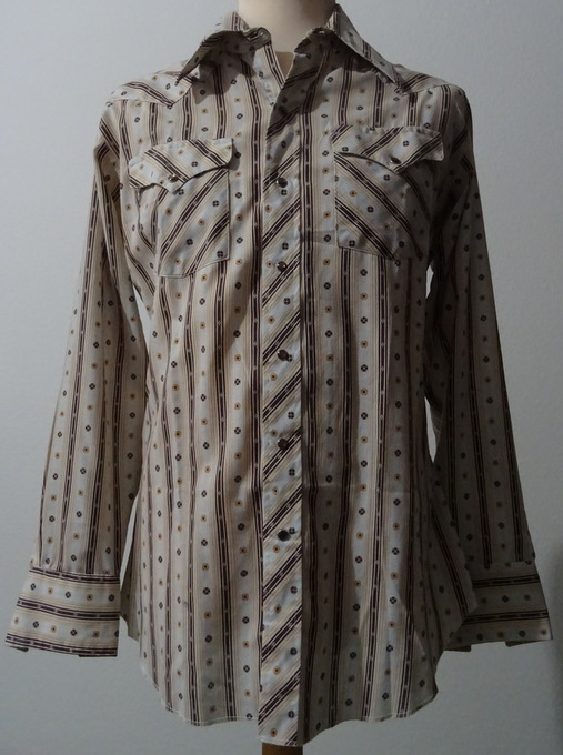 gestreiftes Hemd in den Farben grau, ocker und braunGrösse: 16-342 aufgesetzte Brusttaschenbronzefarbene Perlmuttdruckknöpfevorne und hinten spitz zulaufender SattelMaterial:Mischgewebeguter Zustand