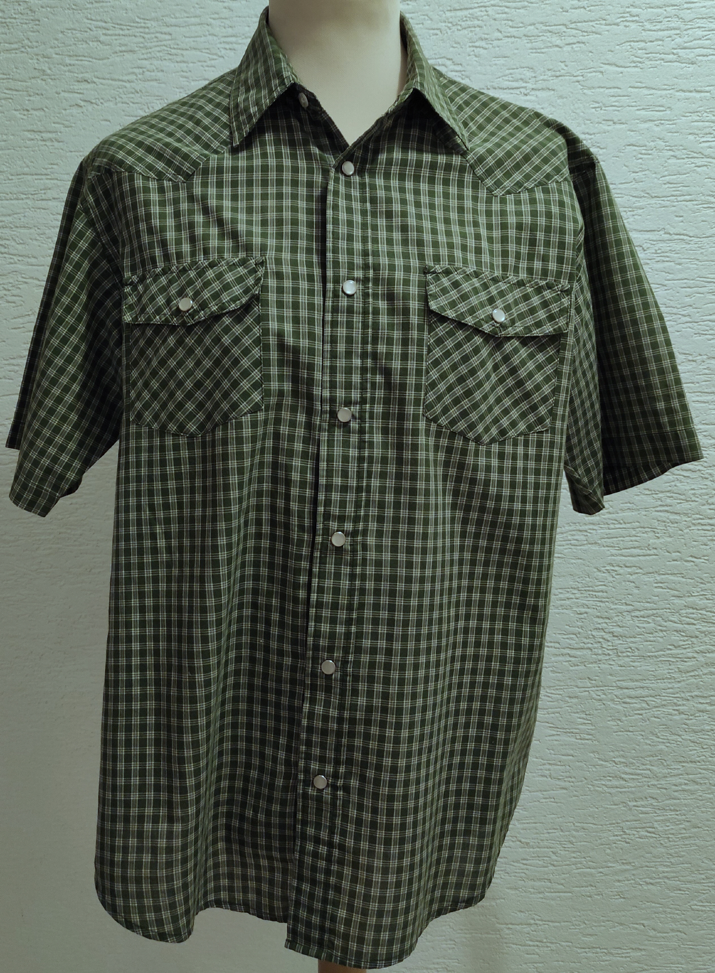 Western Herrenhemd Kurzarm grün-weiss karriert der Marke Western Flains, Gr M2 aufgesetzte Brusttaschenmit weissen Perlmut Druckknöpfengerade geschnittenMaterial:60% Cotton40% PolyesterTop Zustand!