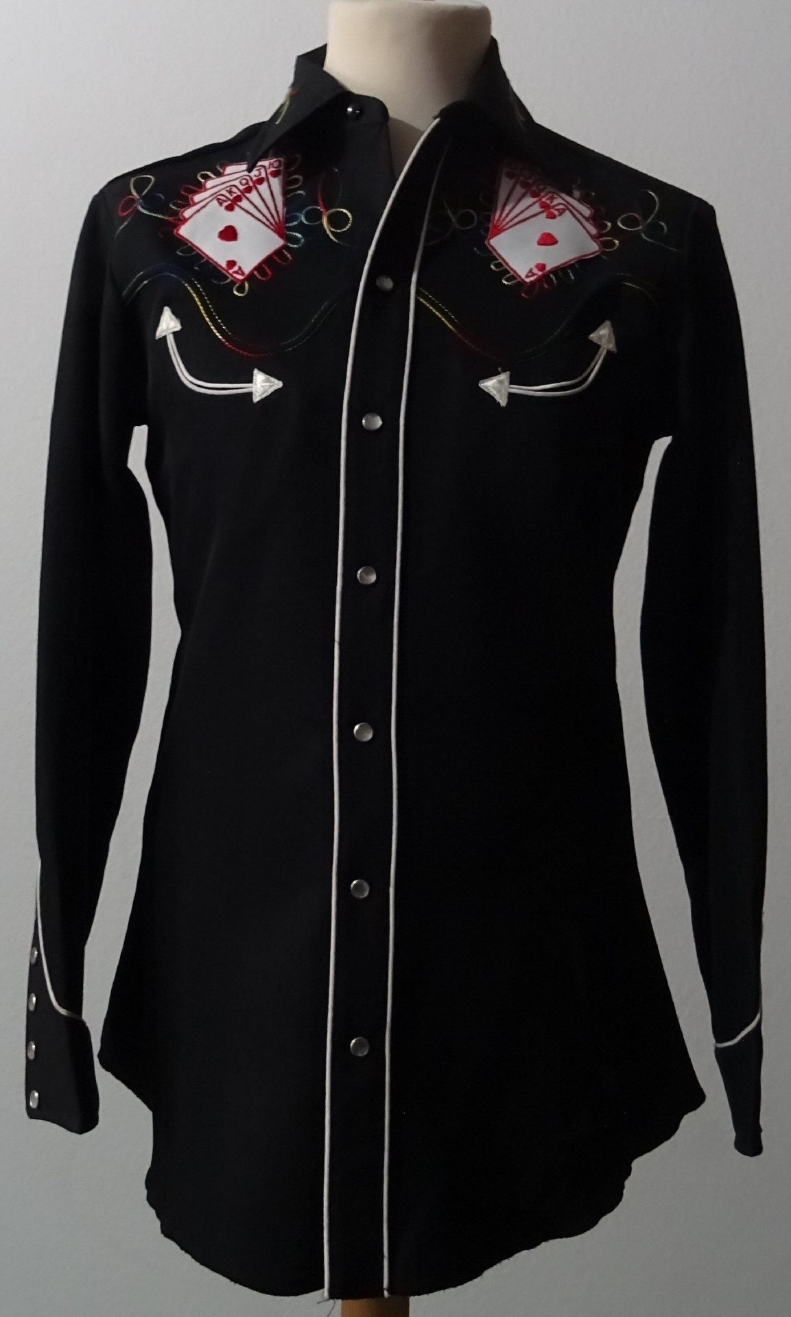 schwarzes Hemd mit aufgestickten Spielkarten "Royal Flush"verziert mit dünnen bunten SteppnähtenUS-Grösse 14 1/2 (etwa Größe S)2 versenkte Brusttaschenan den aufwendig gearbeiten Manschetten befinden sich 5 weiße Perlmuttdruckknöpfeweisse Perlmuttknöpfeim Rücken Sattel mit weisser PaspelMaterial:100% Polyester Neu - Ausstellungsmodell