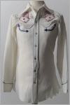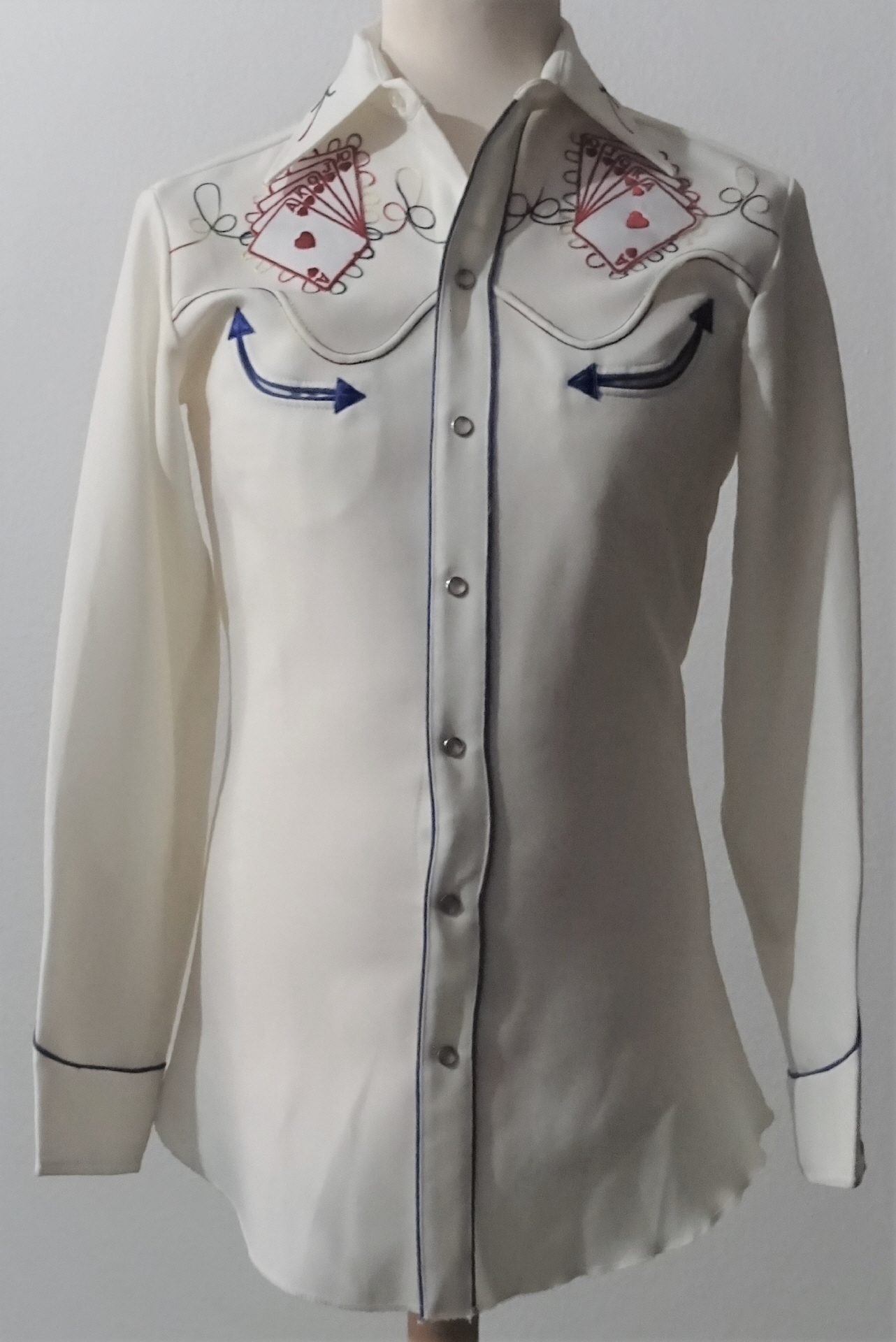 helles cremefarbenes Hemd mit aufgestickten Ornamentenverziert mit dünnen bunten Steppnähten2 versenkte Brusttaschenweisse Perlmuttknöpfean den aufwendig gearbeiten Manschetten befinden sich 5 weiße Perlmuttdruckknöpfeim Rücken Sattel mit schwarzem Paspelmehrfach vorhanden:2x US Größe 141x US Größe 14 1/2Material:100% Polyester Neu - Ausstellungsmodell