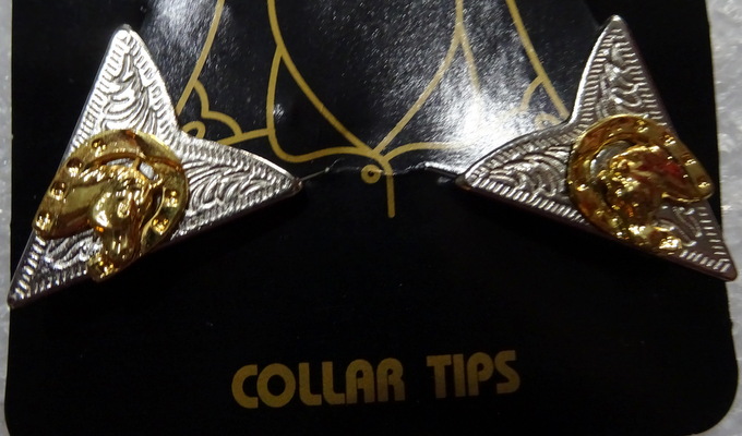 silberfarbene Kragenecken mit aufgesetztem goldfarbenem Hufeisen und Pferdekopf (3,5 x 3 cm)SchraubverschlussNeu