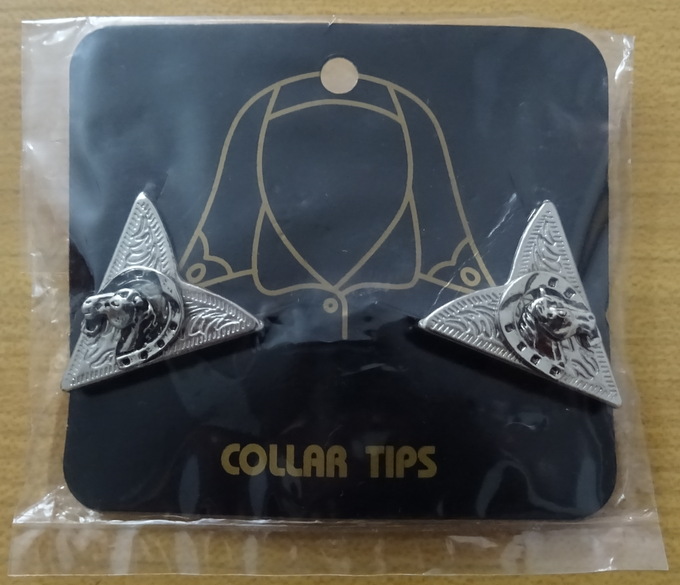 silberfarbene Kragenecken mit aufgesetztem Hufeisen und Pferdekopf (3 x 3 cm)SchraubverschlussNeu