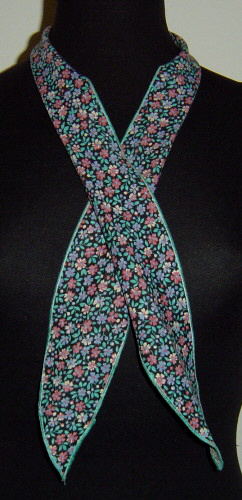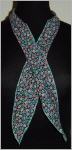 schwarzgrundig mit kleinen Blüten in blau/weiss/altrosa und smaragdgrünen Blättern