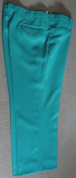 türkisfarbene Tanzhose Bund versehen mit 7 Gürtelschlaufenvorne zwei Eingrifftaschenhinten zwei Eingrifftaschen mit Laschen zu schließen und weiße Perlmuttdruckknöpfenmade in USAMaterial:100 % PolyesterTOP Zustand