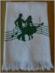 weisses Handtuch mit aufgedrucktem grünem Tanzpaar auf Notenhinten Aufschrift "Let´s Dance"Material: 100 % Cotton gebraucht, guter Zustand
