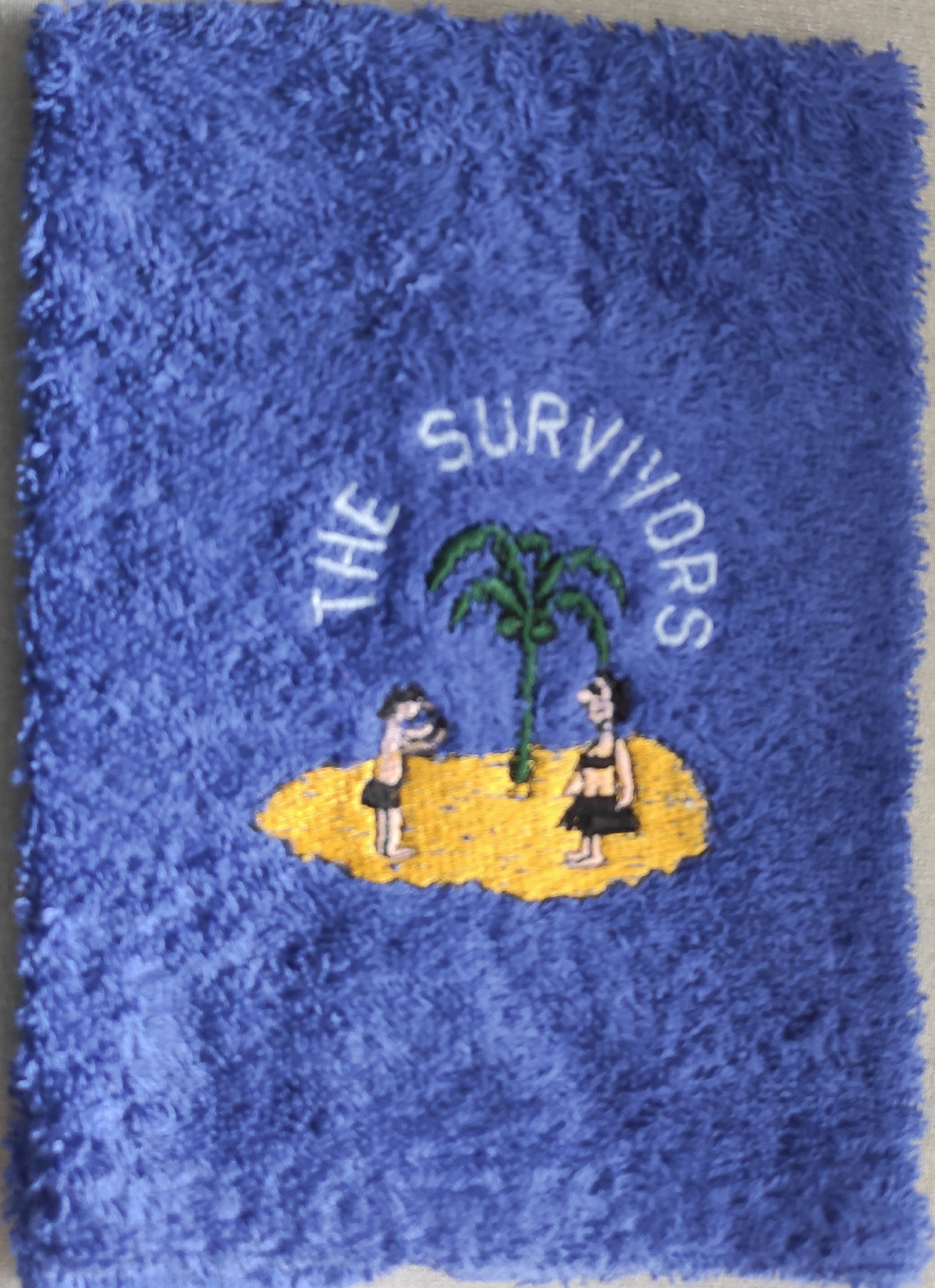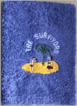 Blauer Herrentowel mit aufgestickter Insel, Palme und zwei Überlebenden und Schriftzug 'THE SURVIVORS'Neuwertig nur einmal getragen