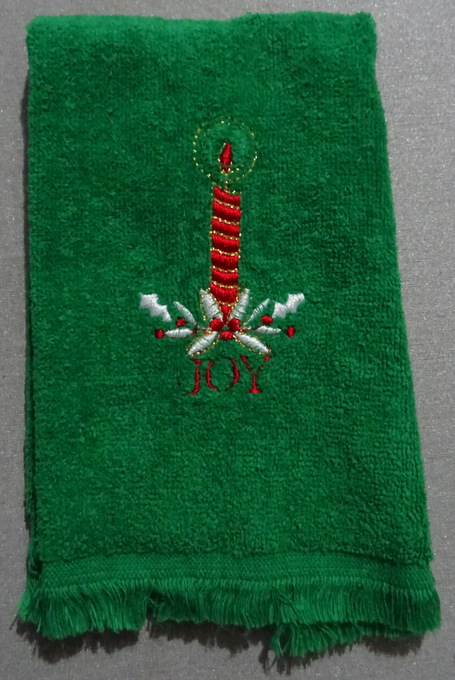grünes Handtuch mit aufgestickter lilafarbenem Kerzeund aufgestickter Aufschrift "JOY"Material: 100 % CottonNEU