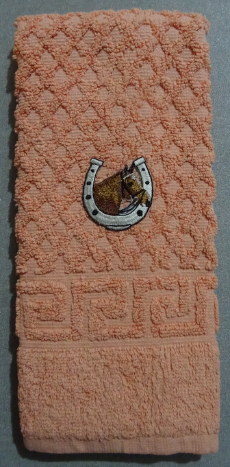 dunkelapricotfarbenes Handtuch mit aufgenähtem silberfarbenem Hufeisen und braunem PferdekopfMaterial: 100 % BaumwolleNEU