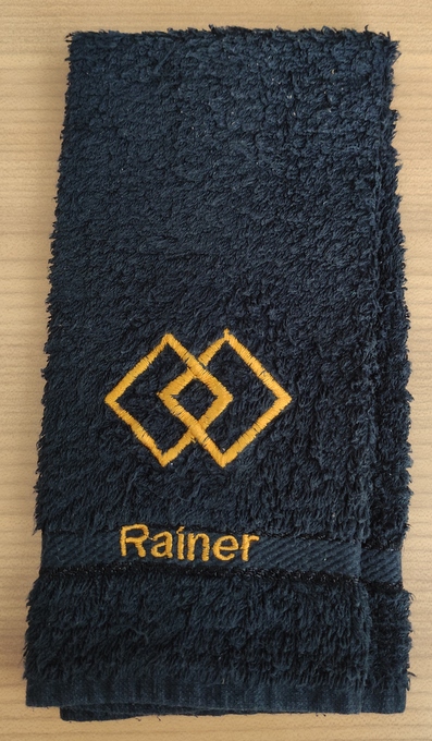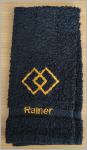 schwarzes Handtuch mit eingesticktem goldfarbenem SD Zeichen und dem Namen "Rainer"Material: 100 % CottonTOP Zustand