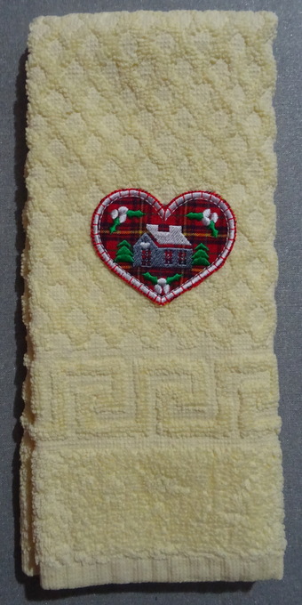 hellgelbes Handtuch mit aufgenähtem dunkelrotem weissumrandetem Herzinnen eine Hütte mit zwei TannenbäumenMaterial: 100 % BaumwolleNEU