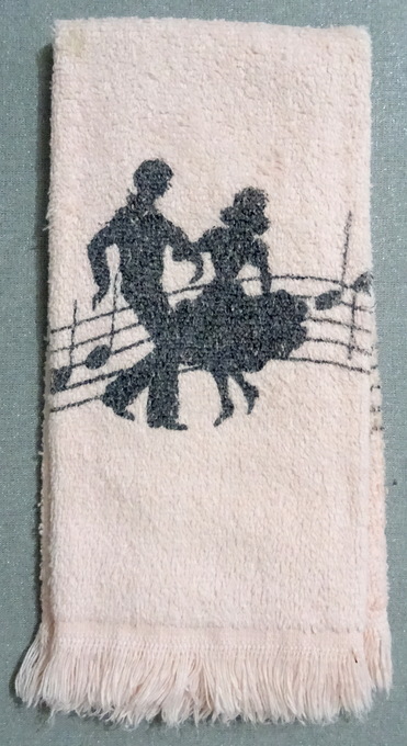 hellrosafarbenes Handtuch mit aufgedrucktem schwarzem Tanzpaar auf NotenRückseite mit "Let´s Dance" auf NotenMaterial: 100 % CottonNEU