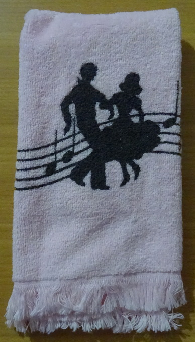 rosafarbenes Handtuch mit aufgedrucktem Tanzpaar, Notenschlüssel und "Let´s Dance" in schwarzMaterial: 100 % CottonTOP Zustand, wie NEU
