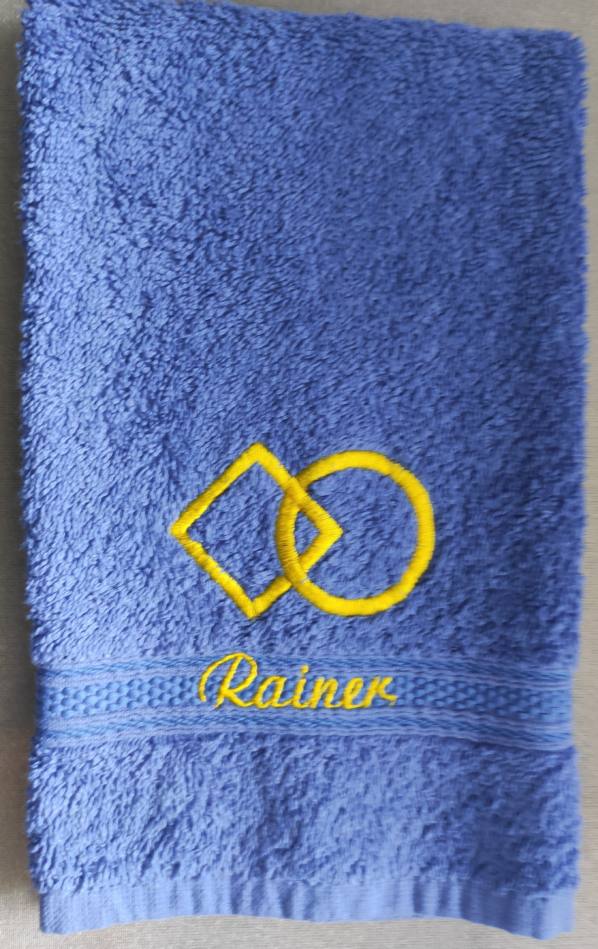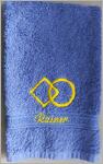 Neues besticktes, blaues Herrenhandtuch von Friesen Frottier Eingestickt wurden das Rounddancezeichen und der Name Rainer in gelb