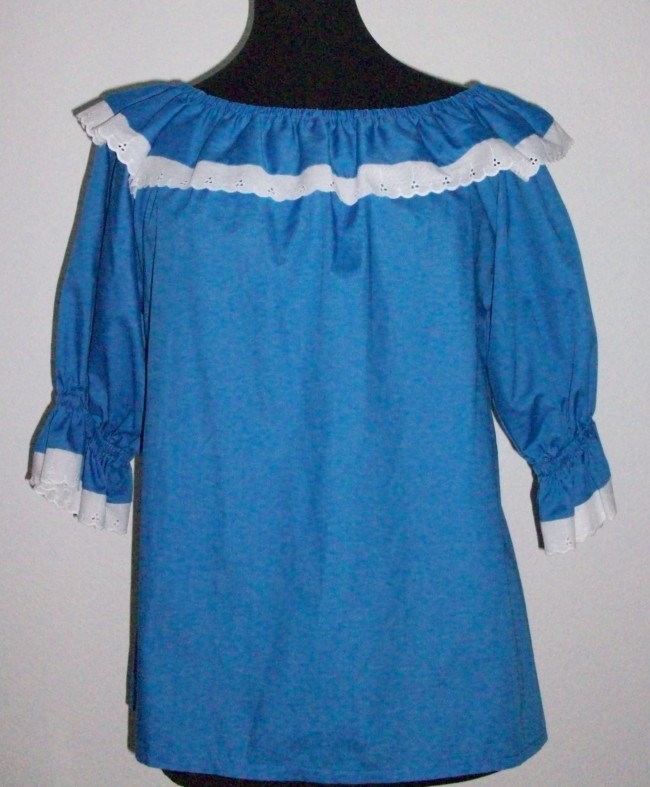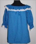 blaue Bluserunder Halsausschnitt mit Gummizug 10 cm Rüsche mit weisser SpitzePuffärmelchenverzuiert mit weisser Spitzeguter Zustand