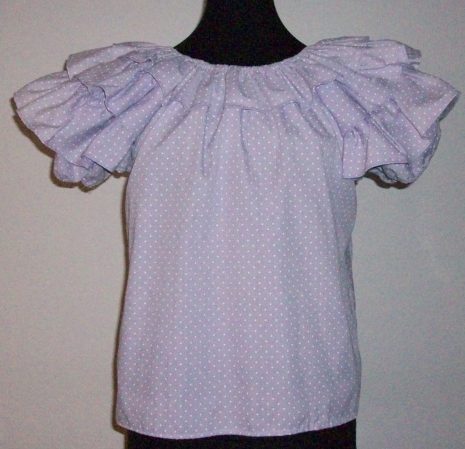 fliederfarbene Bluse mit weissen Tupfen kurze Puffärmelchen mit 2 Stufen Volantum den runden Halsausschnitt mit Gummizug ein 8 cm breiter Volantguter Zustand