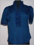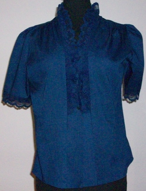 dunkelblaue BluseGrösse XSvorne geknöpft um den Ausschnitt und den kurzen Ärmeln mit blauer Spitze verziert