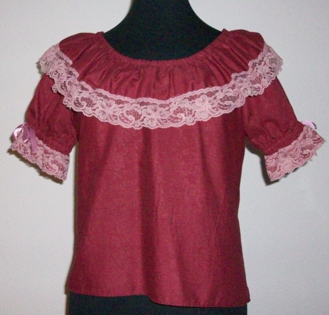 dunkelrote Bluseder Stoff ist zart in sich gemustertrunder Ausschnitt mit Gummizugverziert mit 13 cm Volant mit altrosa Spitzekurze Puffärmel mit Spitze