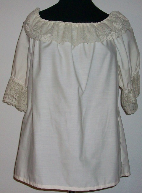 cremefarbene Bluserunder Halsausschnitt mit Gummizug und kurze Puffärmeldürfte Grösse M-L seinjeweils verziert mit 9 cm breiter SpitzeZustand wie neu65% Polyester, 35%Cotton