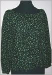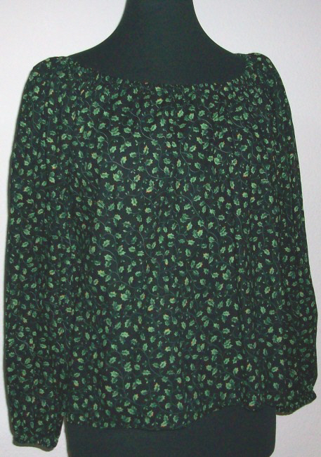 schwarzgrundige Bluse mit grünen Blätterrankenlange ÄrmelHalsausschnitt mit Gummizugfällt klein aus
