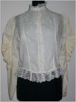 sehr aufwändige hellcremefarbene Langarm-Bluse im Vorderteil mit perlenartigen Knöpfen zu schliessen links und rechts je 13 cm Spitze kurzer Stehkragen, verziert mit weisser Spitze aufwändige lange, schmale Ärmel, (am Ellenbogen 24 cm Umfang, vorne noch 18 cm) im Schulterbereich bis zum Ellenbogen gerafft in der Taille 7 cm Schößchen aus weisser Spitze