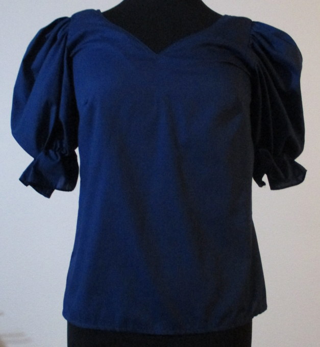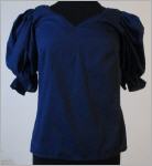dunkelblaue Bluserunder Halsausschnitt der vorne spitz zuläufthinten 37 cm ReissverschlussDie 26 cm langen Puffärmelchen mit Gummizug sind mit 9 cm Volant verziertgerade geschnittenGröße: 8Material:MischgewebeTop Zustand, Ausstellungsmodell