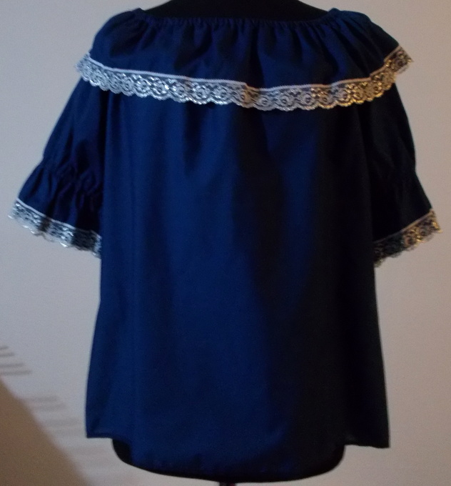 den Ausschnitt ziert ein 11 cm breites Volant, das mit 3 cm breiter weiß-silberner Spitze verziert ist