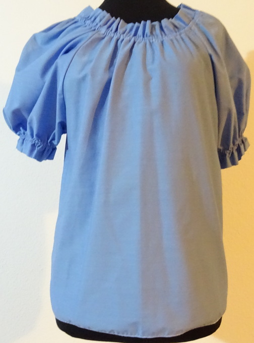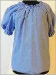 rauchblaue Blusehalbrunder Halsausschnitt mit Gummizug und 3 cm Rüsche31 cm lange Puffärmel mit Gummibund und 3 cm RüscheMaterial:65 % Polyester35 % Cottonneuwertig