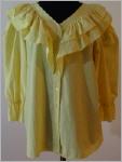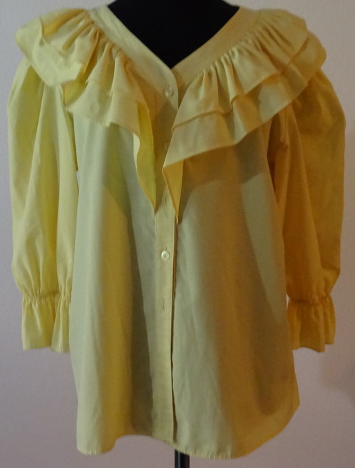 hellgelbe BluseV-förmiger Halsausschnitt, mit 8 cm bzw. 10 cm breitem Volant verziertBluse ist vorne zu knöpfendie 50 cm langen Ärmel mit Gummibund sind mit Volant verziertMaterial:MischgewebeTOP Zustand