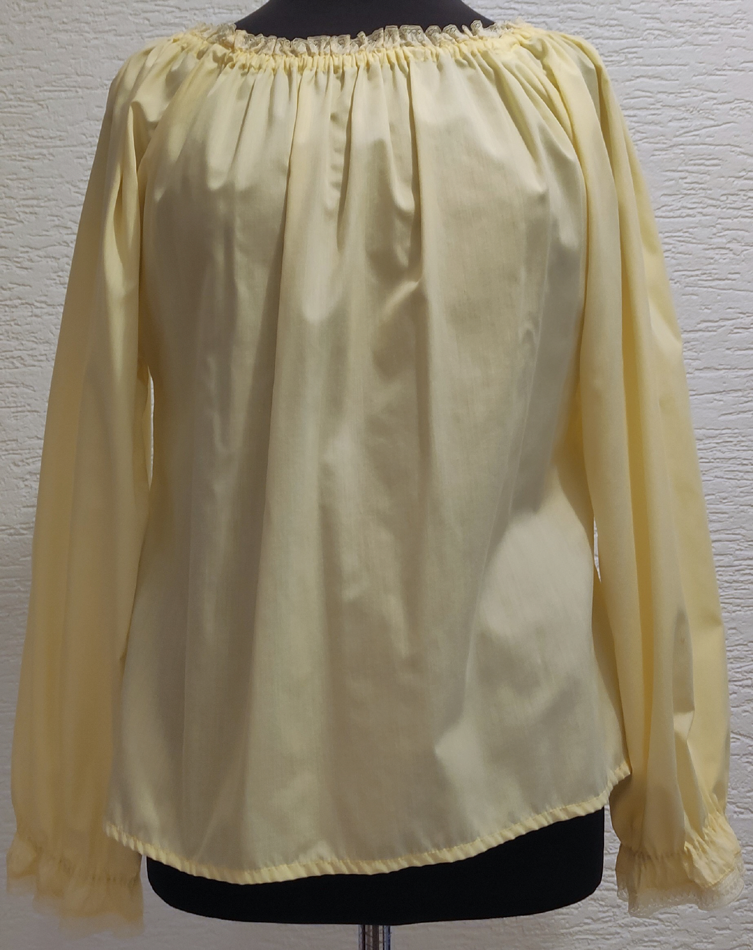 hellgelbe Bluserunder Halsausschnitt mit 1,5 cm heller gelber Spitzegerade geschnittenlange Ärmel, ebenfalls verziert mit hellgelber Spitzesehr guter Zustand