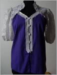 lilafarbene Bluseder Sattel nach vorne mit weissem Spitzeneinsatzebenso die Puffärmel aus weisser Spitzevorne weisse Spitzenknopfleiste mit weissen perlmuttartigen Knöpfen30 cm kurze PuffärmelMaterial:65 % Polyester35 % CottonTOP Zustand