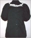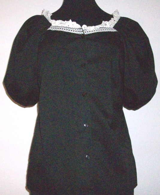 schwarze BluseGrösse Petitetrapezförmiger Ausschnitt mit weisser Spitzeweite, kurze Puffärmelchenvorne geknöpfttopp Zustand65% Polyester, 35% Cotton