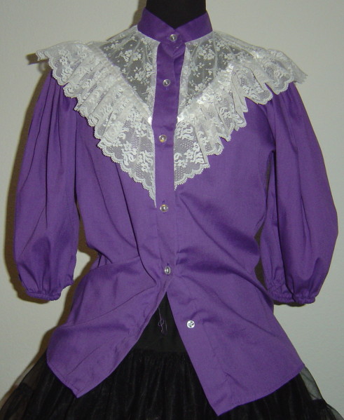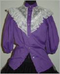 lila Blusemit elegantem, weissem SpitzeneinsatzStehkrägchenvorne geknöpftPuffärmelgerade geschnitten