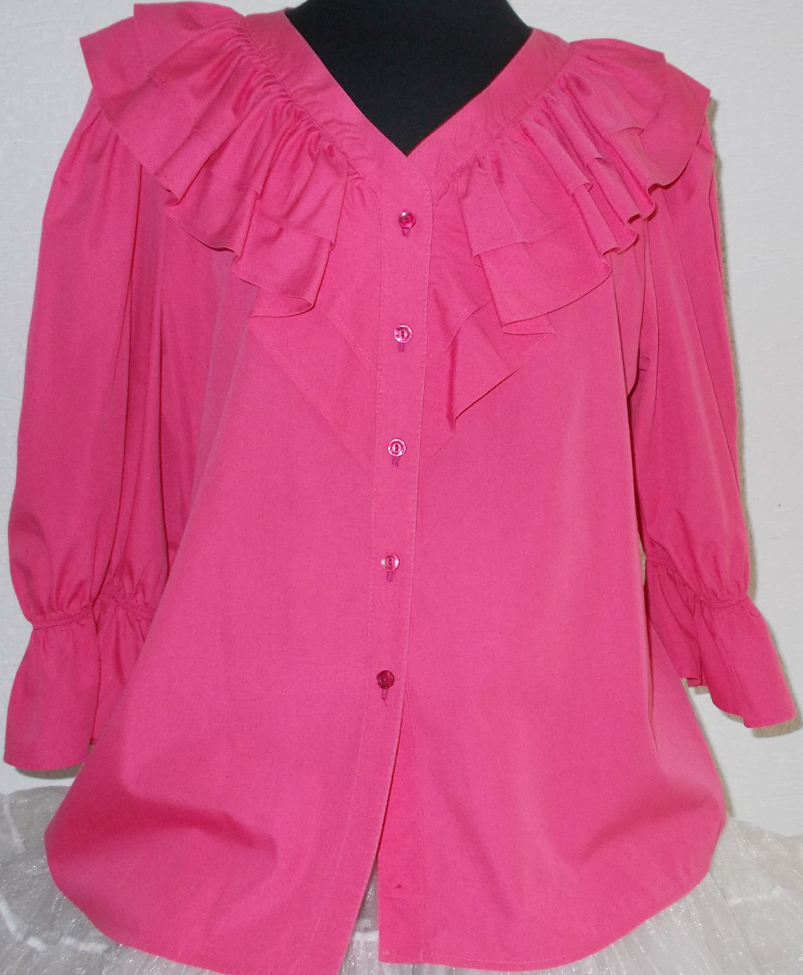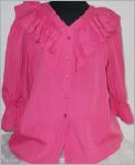 pinke Bluse V-Ausschnitt vorne geknöpft mit doppeltem Vollant in 7 cm und 11 cm BreiteHalbarmärmel in 48 cm Länge, mit 9 cm Volant gerade geschnitten