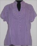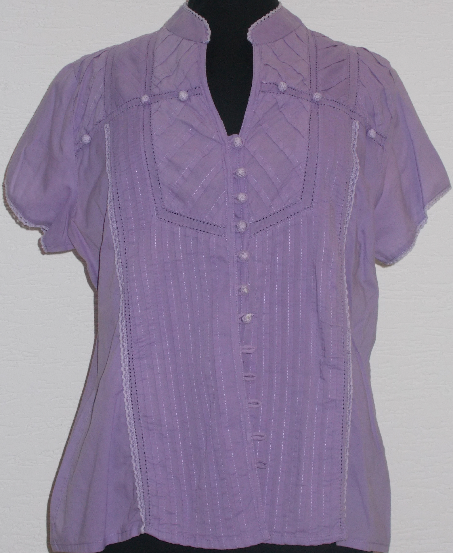 lila Baumwollbluse Gr. 42Häkelüberzogene Perlenknöpfe, geknöpft in Knöpfchenschlingenim Vorderteil plaisiertKurze Ärmel Material:100% BaumwolleTOP Zustand!