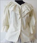eierschalfarbene BluseV-förmiger Halsausschnittrundherum mit 7 cm bzw. 12 cm breitem Volantvorne knöpfbardie Ärmellänge beträgt 33 cm, zusätzlich 9 cm Volant mit GummizugMaterial:65 % Polyester35 % Cottonguter Zustand