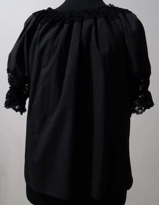 schwarze Bluse runder Halsausschnitt verziert mit 6 cm breiter schwarzer Spitze36 cm kurze Puffärmel verziert mit 10 cm schwarzer SpitzeMaterial:65 % Polyester35 % Cottonguter Zustand