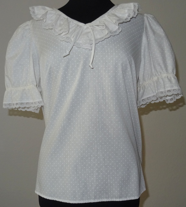 Bluse in weißmit weißen Mini-Dots gemustertnach vorne ein V-Ausschnitt mit Schleife und verziert mit 7 cm Volanthinten 50 cm Reißverschluss28 cm kurze PuffärmelchenMaterial:35 % Polyester65 % Cotton guter Zustand