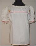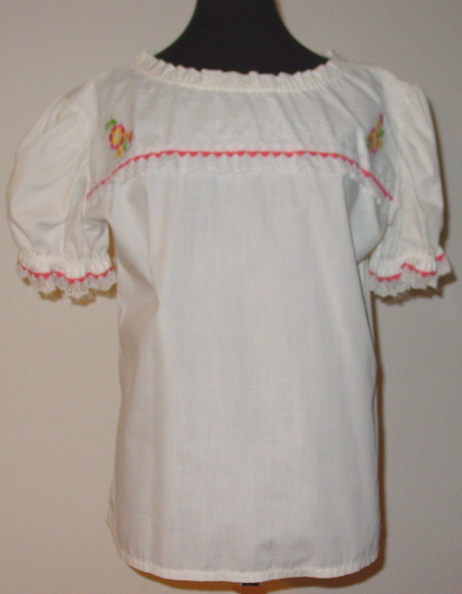 weisse Bluse Grösse M im Vorderteil um den rundenHalsausschnitt ein Spitzenaufsatz mit zwei gestickten Blümchen in pink, gelb, grün verziert mit pinkfarbener Zackenlitze kurze Puffärmelchen, ebenfalls mit Zackenlitze und weisser Spitze