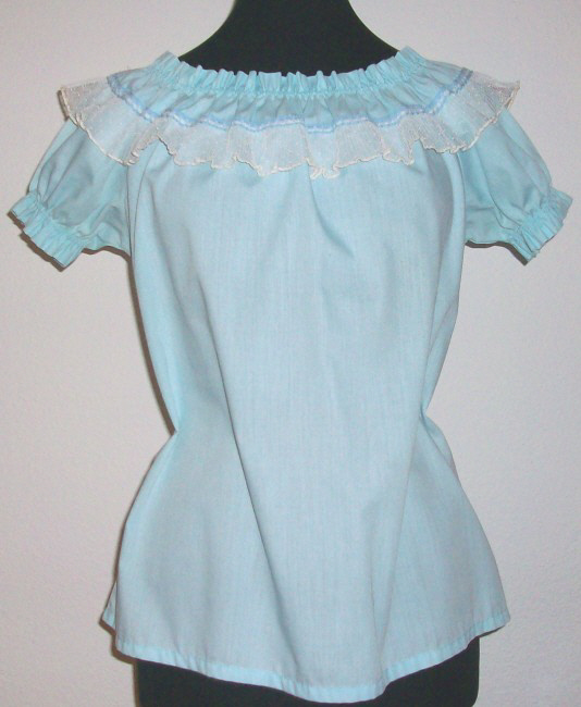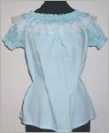 hellblaue BluseGrösse Mrunder Halsausschnitt mit Gummizugverziert mit 5 cm weisser Spitzekurze Puffärmelchen topp Zustand