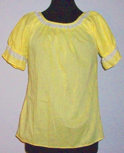 Farbe zitronengelbdürfte Grösse S seinGrösse Mediumum den Halsausschnitt und an den Puffärmelchen weisse Spitze und Lochstickereiguter Zustand