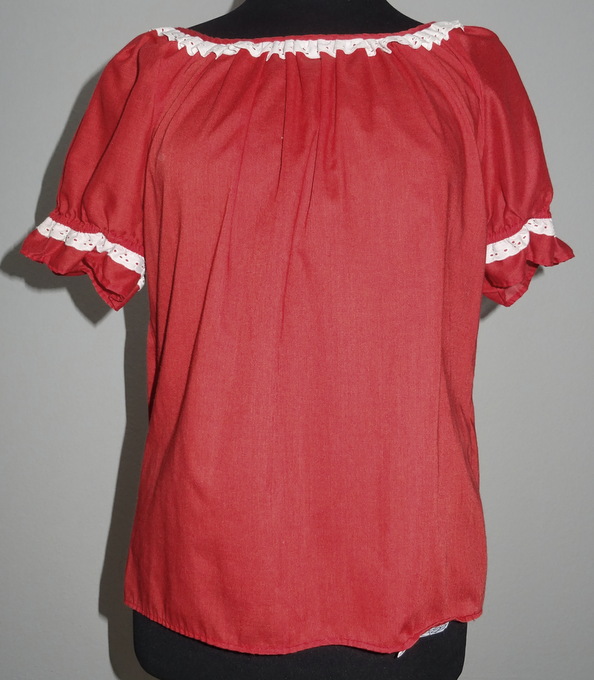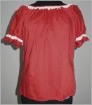 rote Blusehalbrunder Halsausschnitt verziert mit 2 cm weisser Spitze mit Lochstickerei20 cm kurze Puffärmelchen mit Gummizug, ebenso verziert mit weisser Spitze und LochstickereiMaterial:Mischgewebesehr guter Zustand