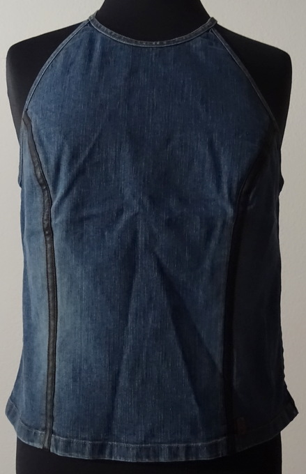 Jeans Top in jeansblauverziert mit schwarzem KunstlederbandärmellosMaterial:23 % Polyester75 % Cotton2 % Elasthanguter Zustand
