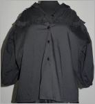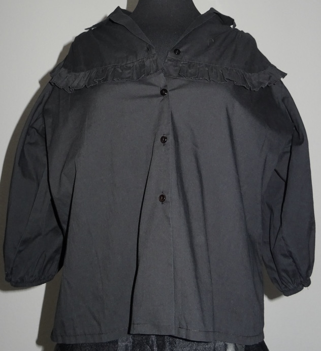 schwarze Blusemit Kragen, vorne V-förmig zulaufender Ausschnitt und geknöpftvorne befindet sich ein angedeuteter Sattel welcher mit 3,5 cm Volant verziert ist40 cm lange Puffärmelchen mit GummizugMaterial:Mischgewebesehr guter Zustand