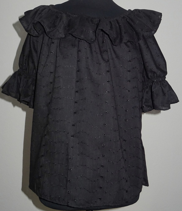 schwarze Bluse mit Lochstickereirunder Halsausschnitt verziert mit 12 cm Volant31 cm kurze Puffärmelchen verziert mit 9 cm VolantMaterial:65 % Polyester35 % CottonNEU NEU NEU
