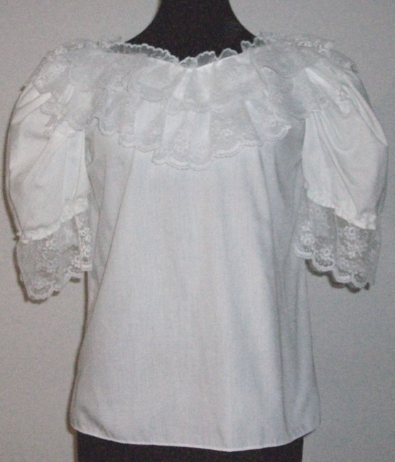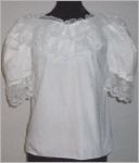 weisse BluseGrösse SV-förmiger Ausschnitt, reich mit weisser Spitze verziertan den Puffärmeln ebenfalls 10 cm breite weisse Spitzetopp Zustand65% Polyester, 35% Cotton