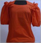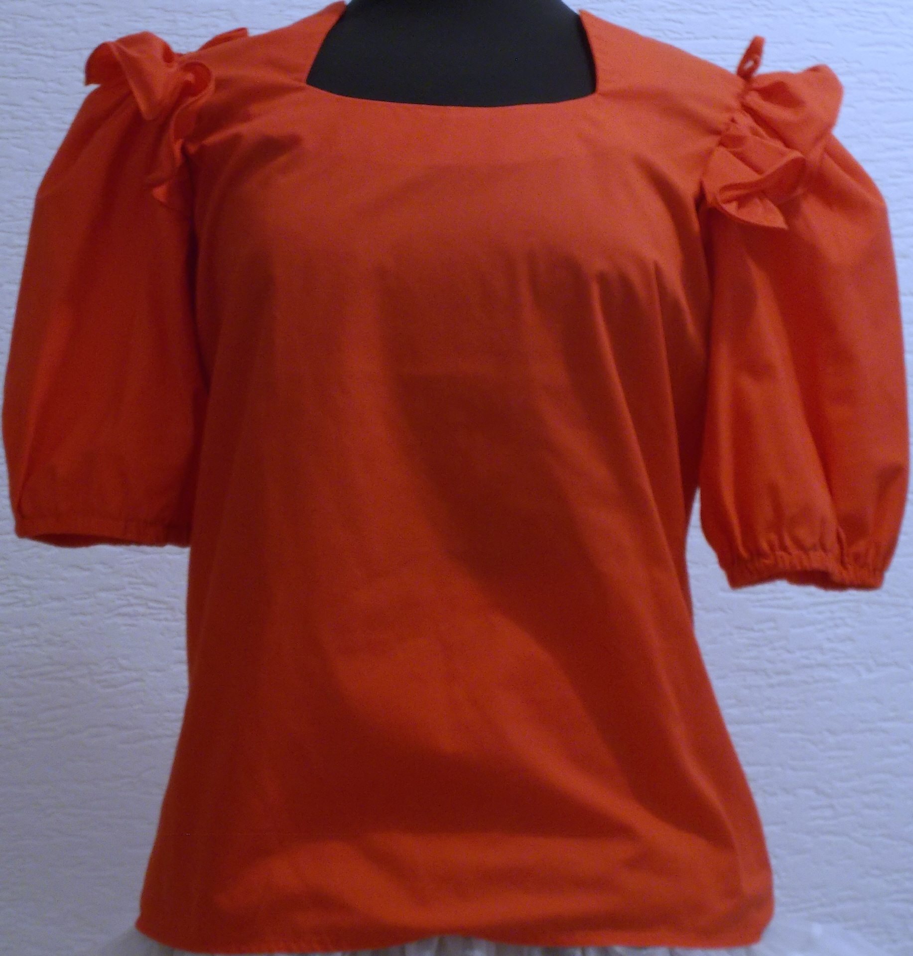tomatenrote Bluse der Marke Malco Modes Mod. 2233 Gr. Mtrapetzförmiger Halsausschnitt auf den Schultern sind Volants mit 7 cm und Schleifchenhinten 50 cm Reisverschlussguter Zustand!